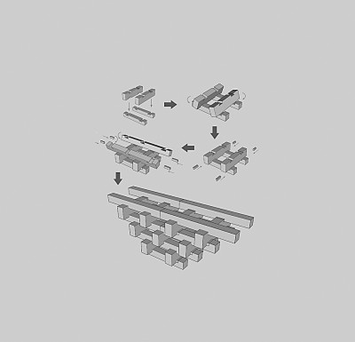 当然,外观整体造型的创新还不能满足设计团队的“雄心”,依托各段主题,风雨廊桥的局部设计还融入了三大创新点:首先是“榫卯新用”,设计团队尝试运用榫卯工艺进行构件连接,将木枋十字相交叠砌的结构创新运用到桥身墙体的构筑中,以“榫卯墙”直接支撑屋顶的拱形曲面,以此探索传统榫卯工艺在墙体设计中的新用途。其次是“曲面新建构”,传统木构廊桥的造型方式多为直线或人字坡顶。为充分体现轻灵的自然之美,我们尝试以“叠枋成拱”的方式突破空间束缚,形成更柔和的屋顶曲线和更宽敞的内部空间,以求拉近自然造化与设计造物之间的距离。最后是“折返新空间”,风雨廊桥的“彩虹伏波”段整体屋檐为曲线,但直线造型的廊道亦在其中,两者相结合构成了可折返的空间,双拱曲面的创新结构也实现了廊桥空间的纵向延伸。