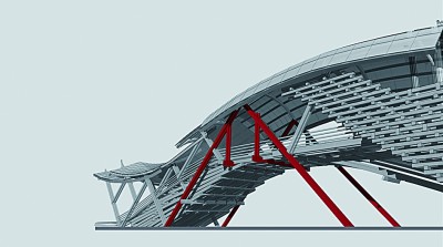 在此基础上,我们将东方美学观念融入风雨廊桥的设计构想中。廊桥的设计力图体现人与自然的相处之道,漫步廊桥之上,亦是徜徉于山水之间,将自身融于濯水天地,便可感受“天人合一”的境界;通过结构的变化和各段廊桥不同主题的呈现,在廊桥有限的空间内营造无限的“境”,追求“超以象外”的审美意蕴;在廊桥顶部构建一系列平滑的曲线,使外形硬朗或柔和的构件交替出现,以达“刚柔并济”的视觉效果;利用廊桥结构形成无数窗口,让如画的山水定格于窗景中,为游客呈现自然景观的灵动变幻,营造出“步移景异”的氛围。