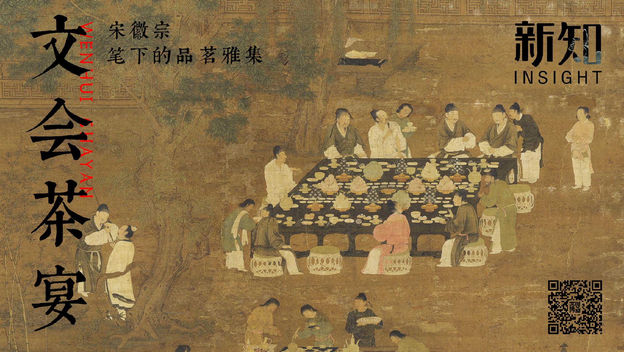 得益于商品经济的发展,宋代筵席的流程较为规范、完整。《文会图》利用全景式构图,在精妙的工笔绘法之下,将雅集宴饮、点茶品茗与文人风雅三个时空串联成线,记录下当年的文会茶宴。