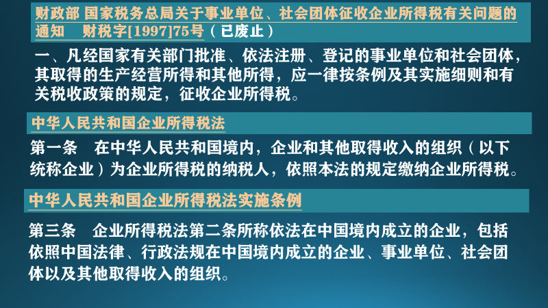 1997年10月,财政部、国家税务总局发布《关于事业单位社会团体征收企业所得税有关问题的通知》开始把事业单位生产经营所得和其他应税所得纳入企业所得税的征税范围。这实际也是事业单位市场化改革的必然结果。