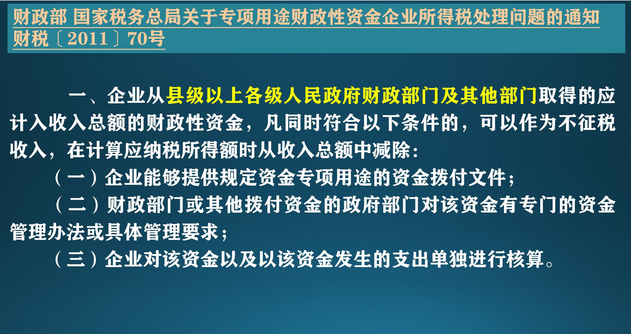 许多人一提到财政性资金就觉得肯定是要财政部门直接给付的,但是财税〔2011〕70号非常明确,县级以上各级人民政府的其他部门给企业的资金只要同时符合文件中提到的3个条件,也是可以作为不征税收入的。但是对其他部门,在70号文和其他税务文件里都没有进一步的解释,税局对财政部门或者行政部门的给付一般都会认可,但是对此类事务中的事业单位是否是政府部门却持否定意见,导致税企争议。
