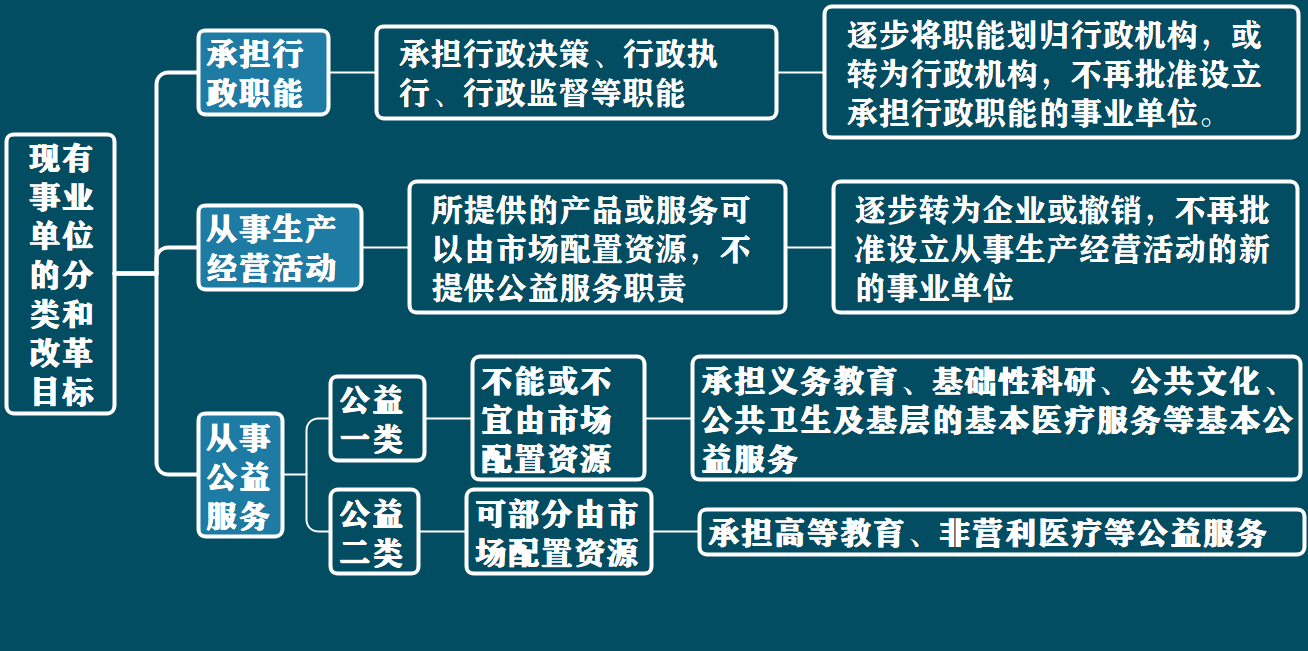 2011年3月《中共中央国务院关于分类推进事业单位改革的指导意见》等一系列文件发布,明确按照社会功能将现有事业单位划分为承担行政职能、从事生产经营活动和从事公益服务三个类别。事业单位的分类改革目标如下图。