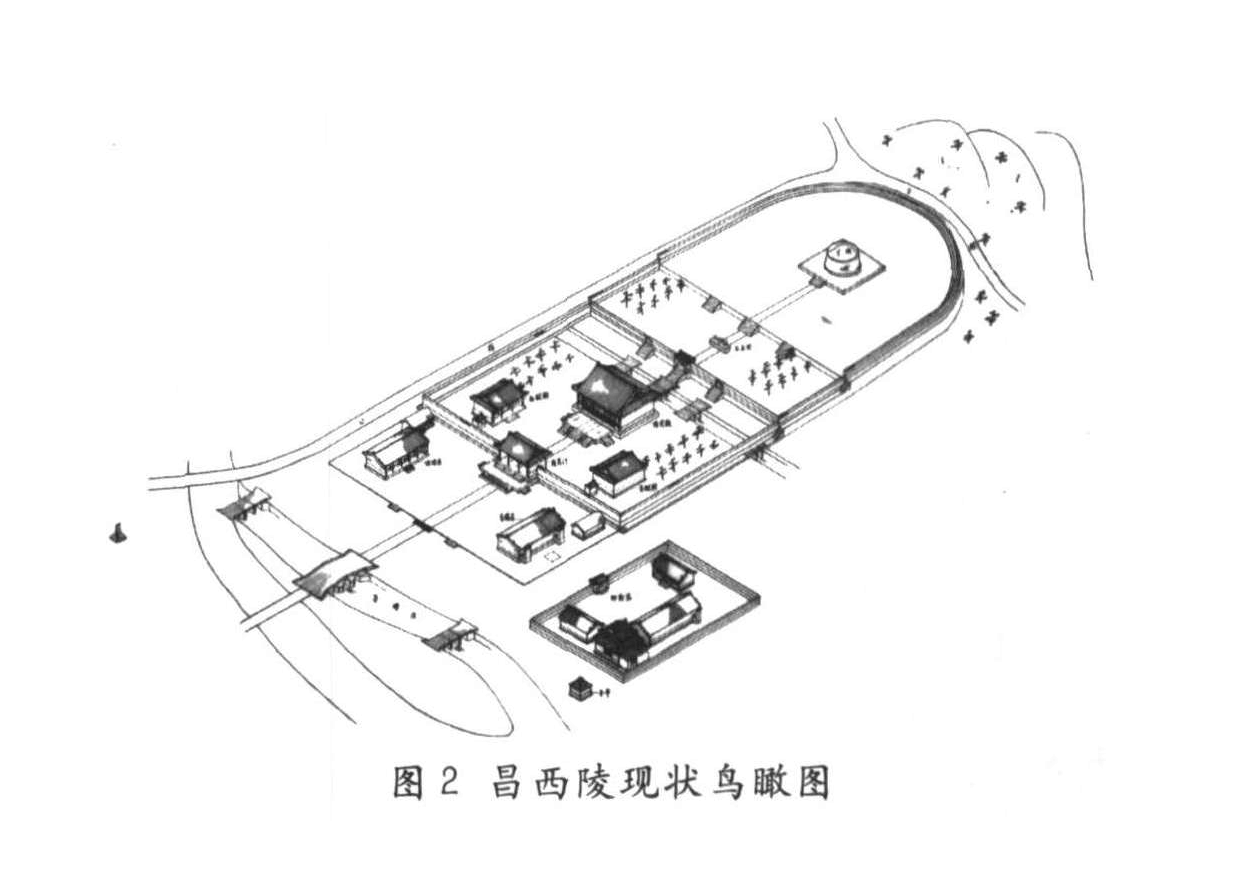 清入关之后,皇室成员全部埋在了清东西陵两大陵区。昌西陵建在嘉庆的昌陵西侧一两公里,是清西陵目前唯一对外开放的皇后陵。若从空中俯视,昌西陵整体建筑呈现一个方圆结合的状态,夹在玉带河和一座小山包之间,受到狭小空间挤压。按清代陵寝规制修建,每个院落的尺度已经到了极限。陵寝最北面的围墙(“后宝墙”)形成了半圆形,而不是常见的椭圆形。