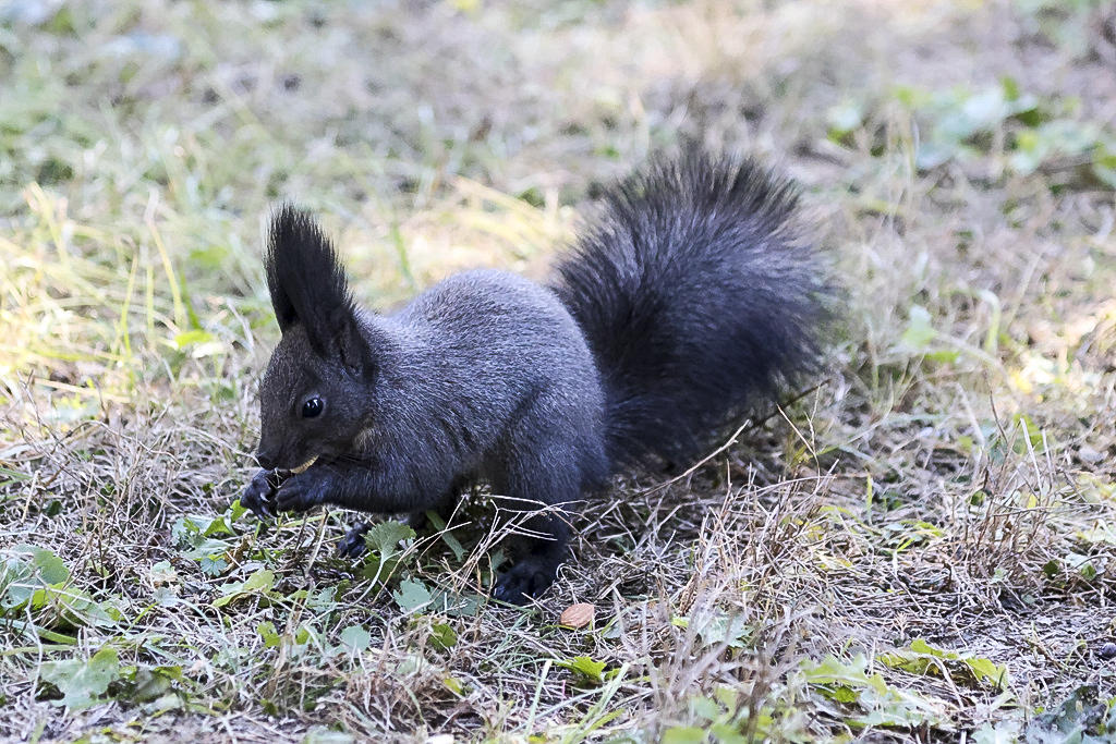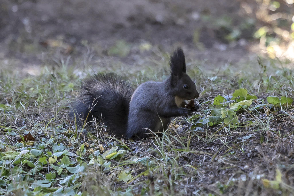 来前特意带了一包干果,我蹲下来把坚果放在手里,小家伙立刻就欢快的凑过来,就着手开吃。吃完一颗,又从我的手上把食物叼起来藏到草丛里,再用两只前爪轮流拍打几下,留待食物缺少的时候再吃,精明的像人一样,也知道深挖洞广积粮。
