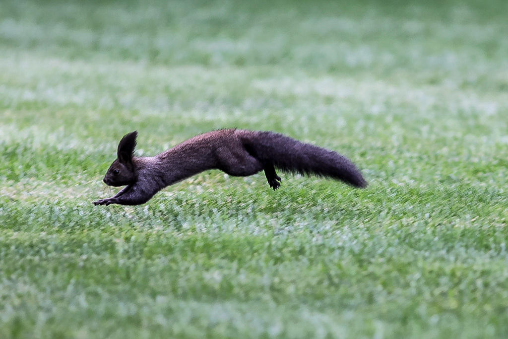 它们奔跑或者跳跃的时候,总是先抬起两只前腿,然后两条粗壮有力的后腿使劲向前一蹬,身子就会凌空向前窜出好远,动作敏捷,身手矫健,那条蓬松的大尾巴像大海中航行的船舵一样保持着身体平衡。着地的时候相反,两只前脚先落,往后一拨拉,身子向前扑出,跟着后腿再次蹬出。