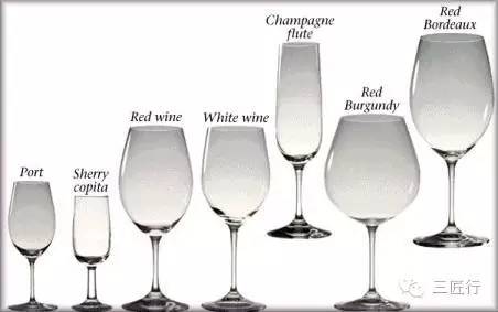 ▲从左到右依次为波特杯、餐后甜酒杯、红酒杯、白酒杯、香槟杯、勃根地酒杯、波尔多酒杯