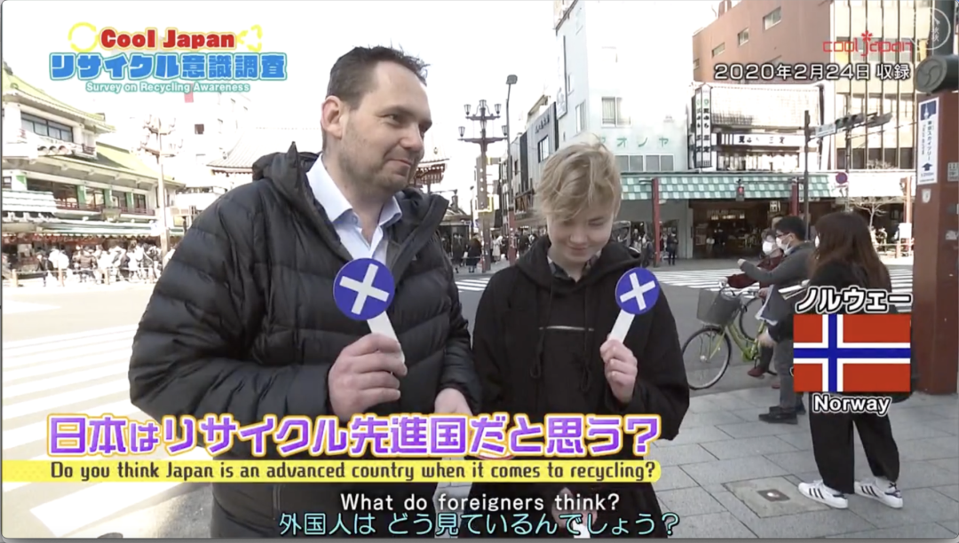 ●Cool Japan节目中,街头受访的挪威父子否定了日本的垃圾循环水平。该节目通常会将不同背景的外国人邀请到演播室中,评论日本文化的某些方面,类似于国内的《非正式会谈》。点击观看