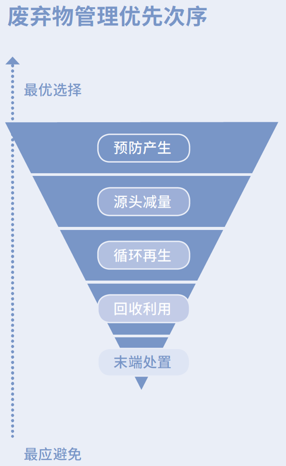 从废弃物管理的优先次序来说,首先是预防产生和源头减量,其次是循环再生、回收利用,最终才是没有任何资源利用的末端处置;更多的问题要由上一层对策来解决,尽力后仍然解决不了的才进入下一层对策,越往下需要应对的废弃物体量,包括污染物排放量应该越少,最终从上到下形成一个倒三角。