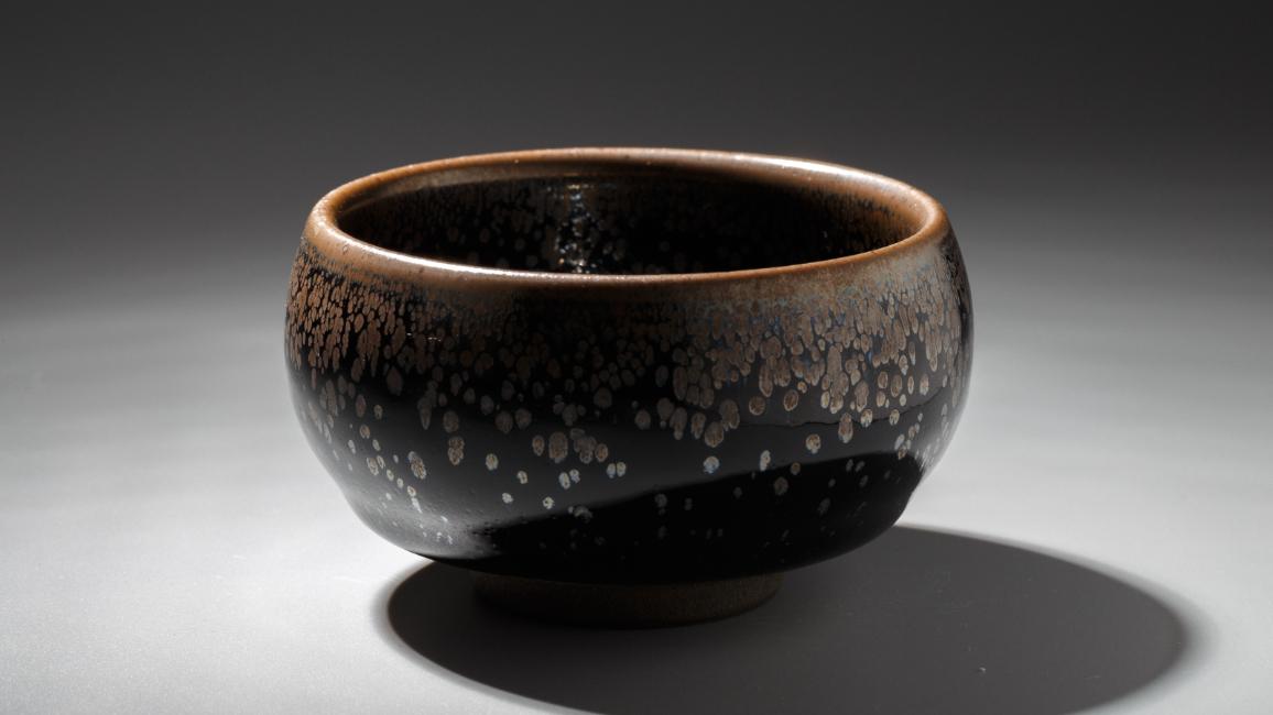 建盏始烧于五代末北宋初年,初期出品以无斑纹通体乌黑的茶盏为主,称为“乌金釉盏”。宋徽宗非常推崇建盏,他在《大观茶论》里写道:“盏色贵青黑,玉毫条达者为上,取其焕发茶采色也。” 这里说的玉毫条指的是盏面上形成银褐色细密条纹,像兔子的毫毛,故也叫做兔毫盏。关于建盏还有个小故事,相传宋徽宗在睡梦中神游到了广寒宫,恍惚之间竟然站在了“广寒清虚之府”牌匾之下。正惊异彷徨间,在不远处传来了悦耳的笛声,循着笛声居然看到了的嫦娥。一曲终了,久无人烟的月宫因为宋徽宗的到来让嫦娥仙子异常兴奋,被热情的邀请去品尝仙茗。在千年寒玉雕成的茶几上,摆放着琳琅满目的建盏,或是流畅的兔毫,或是羽化亮丽的鹧鸪斑,或是灿若星空的曜变。
