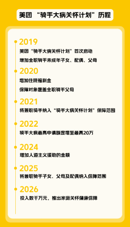 ▲2019年至今,美团“骑手大病关怀计划”经历9次升级调整,不断扩大覆盖人数、保障范围(图源:美团)