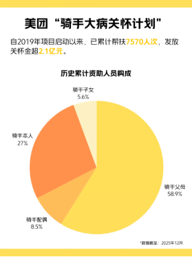 美团针对骑手群体开展的调研结果显示,在“最关心的生活难题”排序中,“家人健康”以显著比例位居首位。此次美团官方发布的资料显示,在“骑手大病关怀计划”已发放的超过2.1亿元关怀金中,有超过70%用于帮扶骑手的父母、配偶及子女,其中骑手父母的占比达58.9%。“这组数据非常直观地说明了,对骑手群体的关怀,尤其对其主要家庭成员的关怀需进一步深化保障。”上述负责人指出,此次新增的住院诊疗补充医疗保障,也是在此前已有的一次性援助、住院津贴等基础上,让骑手家庭在面对长期住院治疗时,能有更坚实的保障支撑。