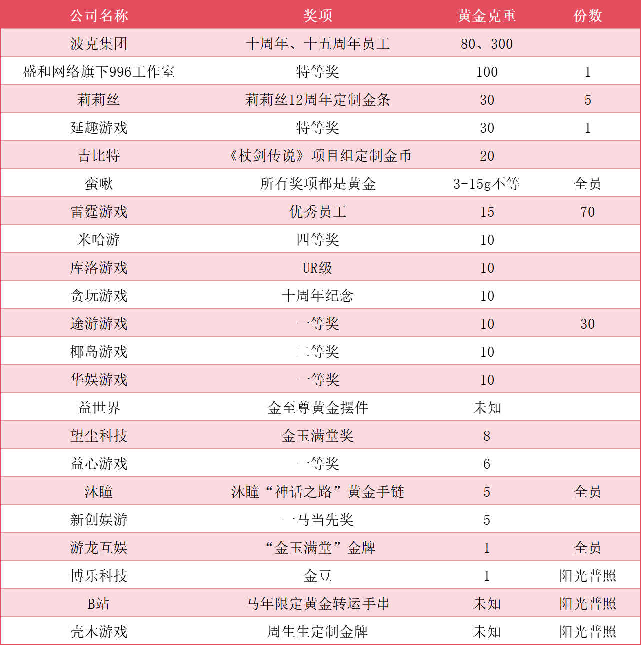 游戏公司发黄金主要有3种形式。第一种把黄金当作阳光普照奖,全员发放,比如B站、游龙互娱、壳木游戏、博乐科技等。