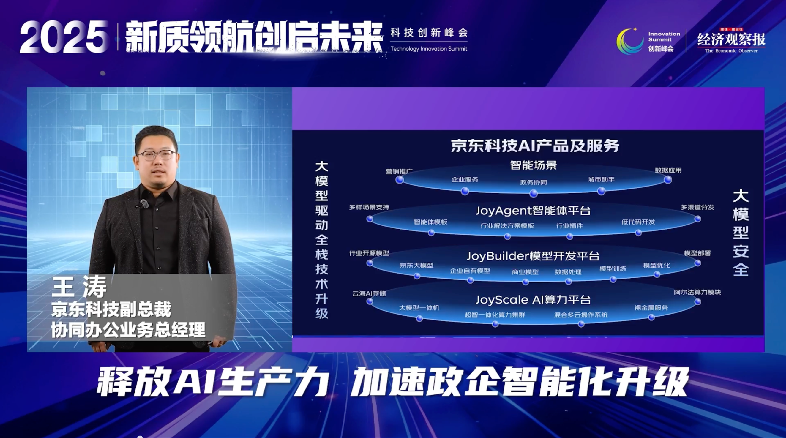 京东科技副总裁王涛介绍了京东科技在大模型领域的全栈布局,其构建的大模型产品和服务矩阵已深度应用于政务 “一网协同”“一网通办”“一网统管” 及企业协同办公场景,孵化超 3 万个高价值数字员工,多项案例获行业权威认可,智能问数核心技术位列全球第四。