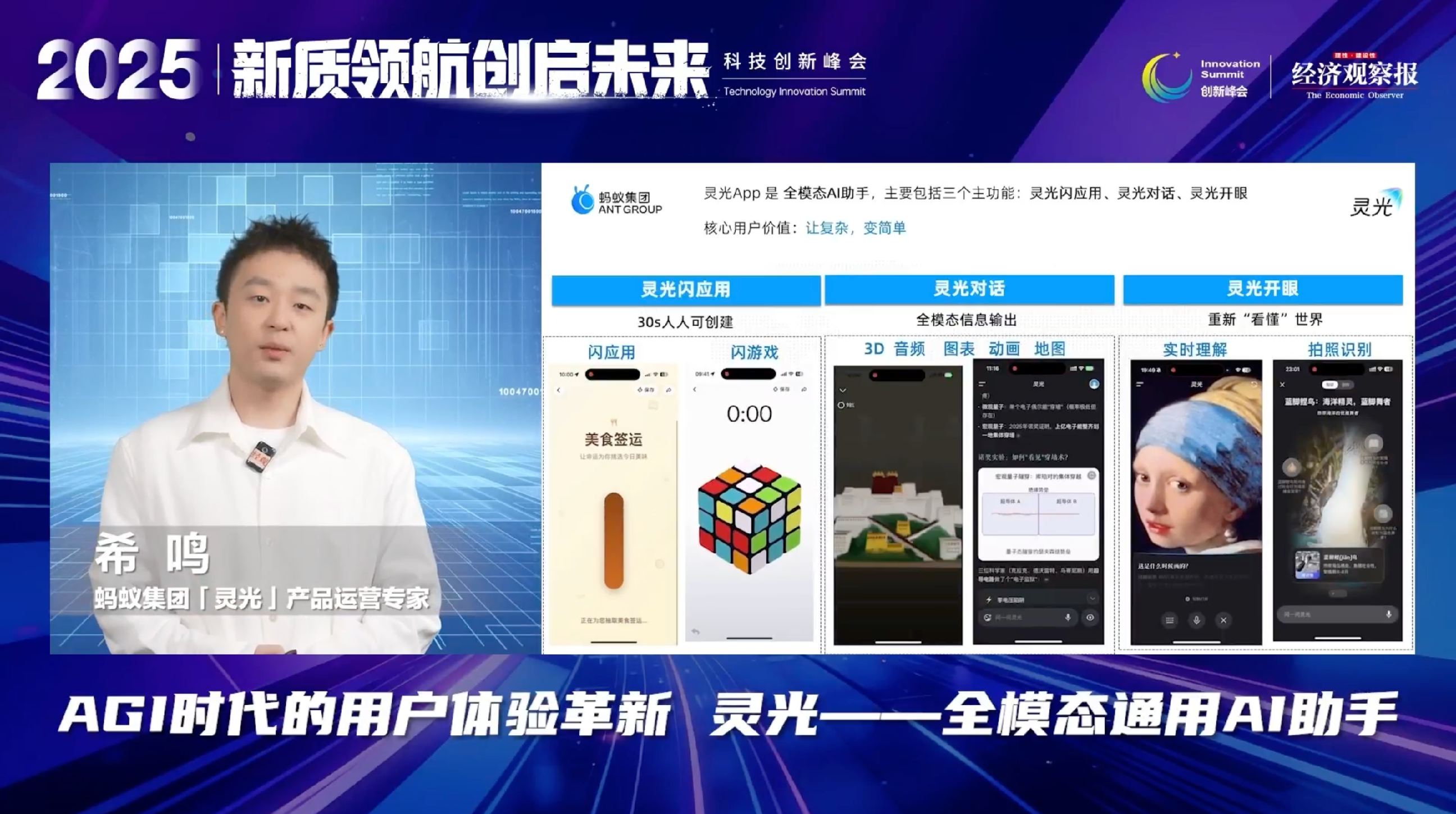 蚂蚁集团「灵光」产品运营专家希鸣聚焦 AGI 时代用户体验革新,详解了灵光 APP“闪应用、对话、开眼” 三大核心功能,以全模态交互、低门槛创造等特性,推动 C 端 AI 应用从 “能聊” 走向 “能用”,累计生成超 1200 万个闪应用,覆盖生活、教育、娱乐等多元场景。