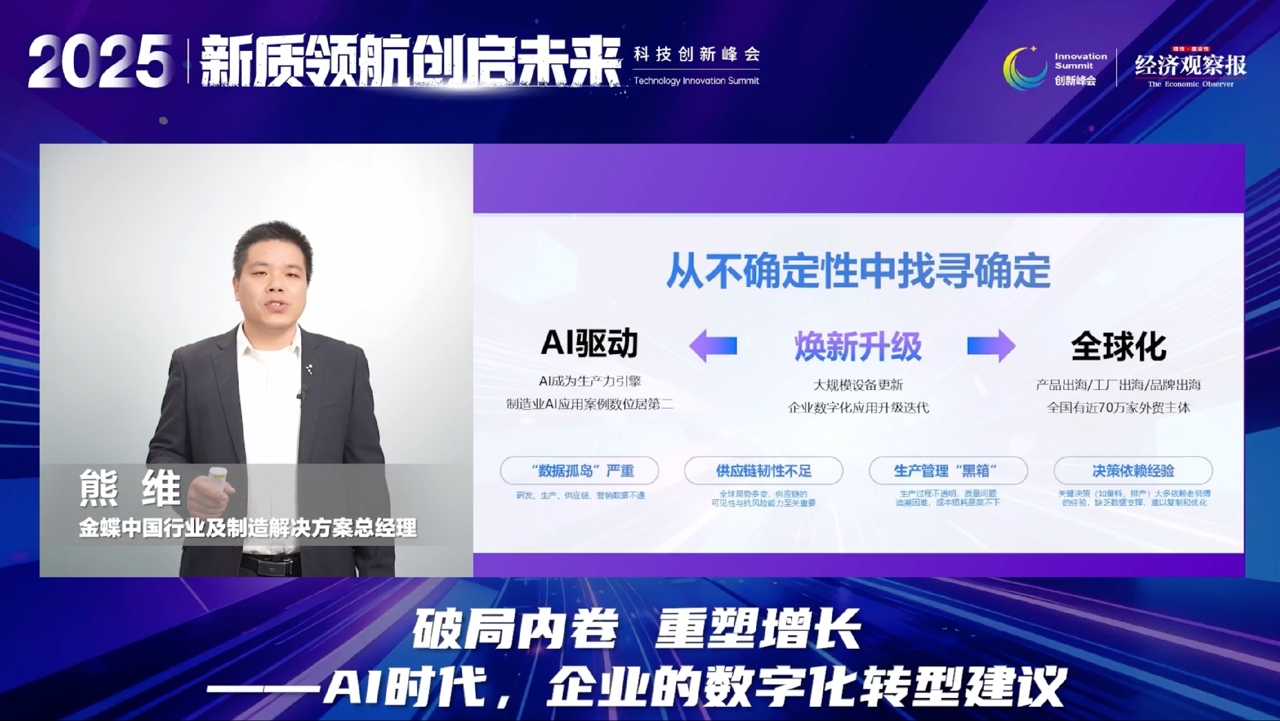 金蝶行业解决方案部总经理熊维针对企业 “内卷加剧、增长乏力” 的痛点,提出 AI 时代数字化转型八大建议,强调构建弹性数字底盘、聚焦行业痛点、打通全价值链数据流等核心方向,其 AI 原生解决方案已服务超 740 万家客户,覆盖众多头部企业与专精特新企业。