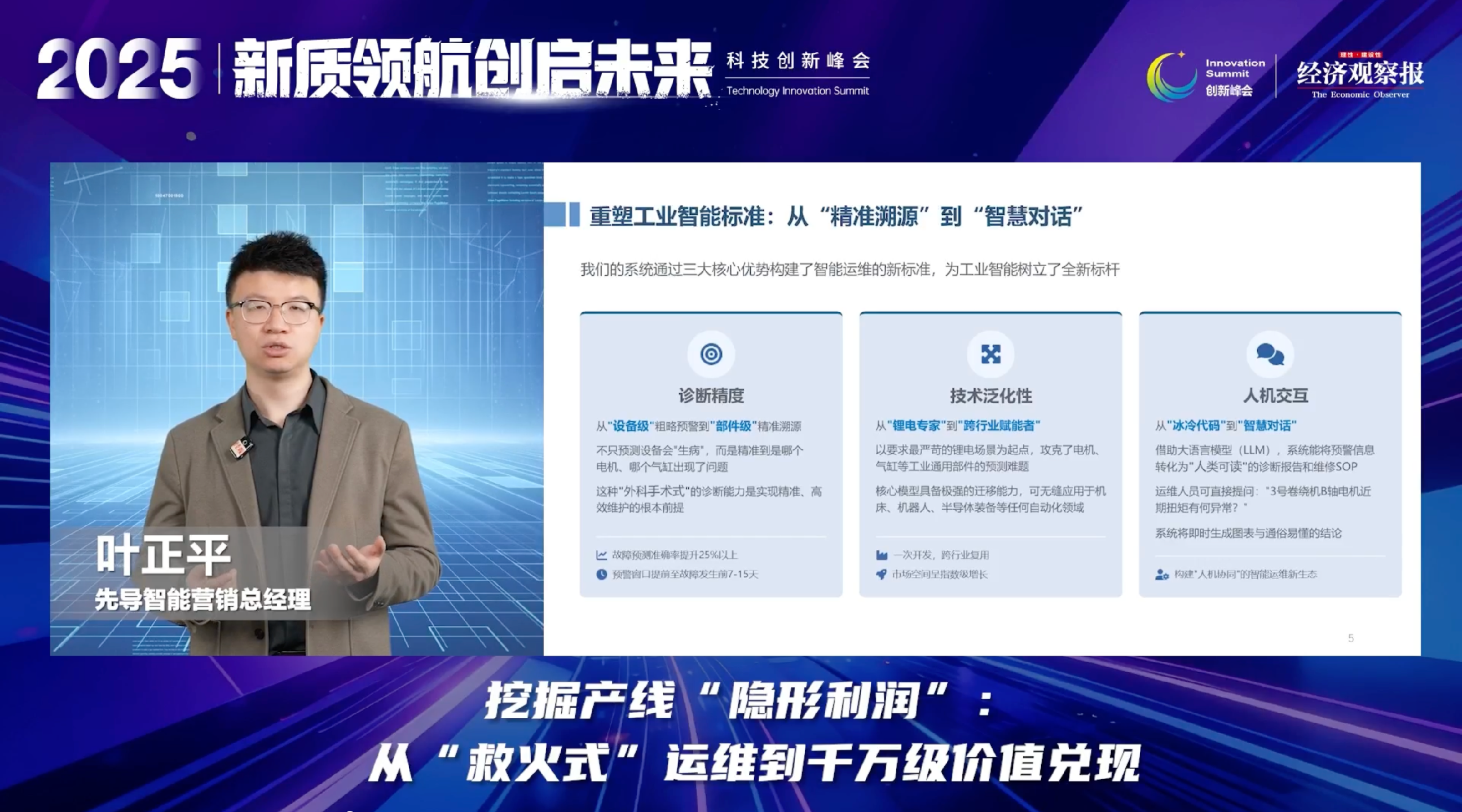 先导智能营销总经理叶正平分享了预测性维护解决方案的创新实践,通过多模态大模型打通设备数据,实现提前 7-15 天预判故障,为头部客户年节省超 1000 万元成本,该方案已成功泛化至半导体、光伏等多个行业。