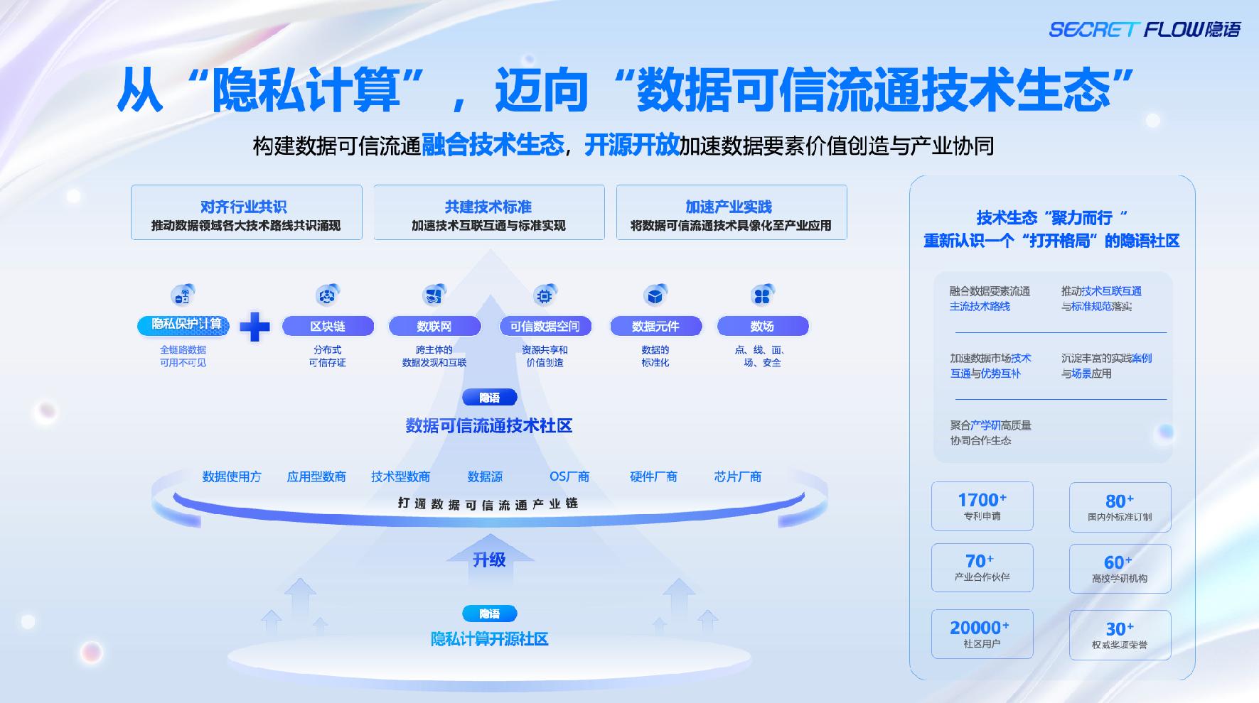 8月14日,隐语“可信隐私计算开源社区”在三周年之际宣布升级:由“可信隐私计算开源社区”扩容为“隐语·数据可信流通技术社区”,将逐步覆盖隐私保护计算、可信数据空间、数据元件、数联网、区块链、数场等六大技术路线并形成多技术路线的融合,未来通过开源代码、共建标准和共创场景,为医疗、金融、城市治理、制造等多个领域提供一站式、可验证、可互联的数据流通技术底座。