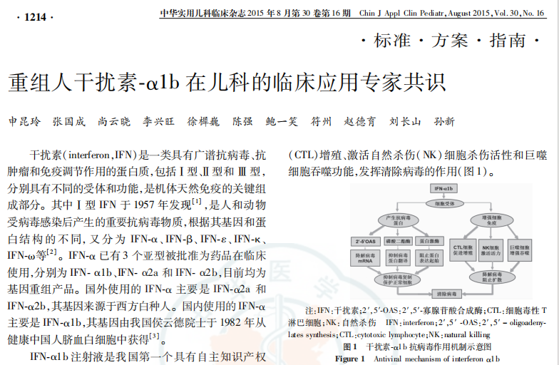 [4] 申昆玲, 张国成, 尚云晓, 等.重组人干扰素-α1b在儿科的临床应用专家共识 [J] . 中华实用儿科临床杂志, 2015, 30(16) : 1214-1219.