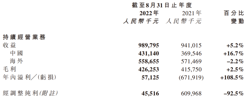 而在随后公布的2022财年全年报告中,枫叶教育的利润仍继续减少。截至2022年8月31日止年度业绩,枫叶教育取得收益9.9亿元,同比增加5.2%;但年内经调整纯利4551.6万元,同比减少92.54%。