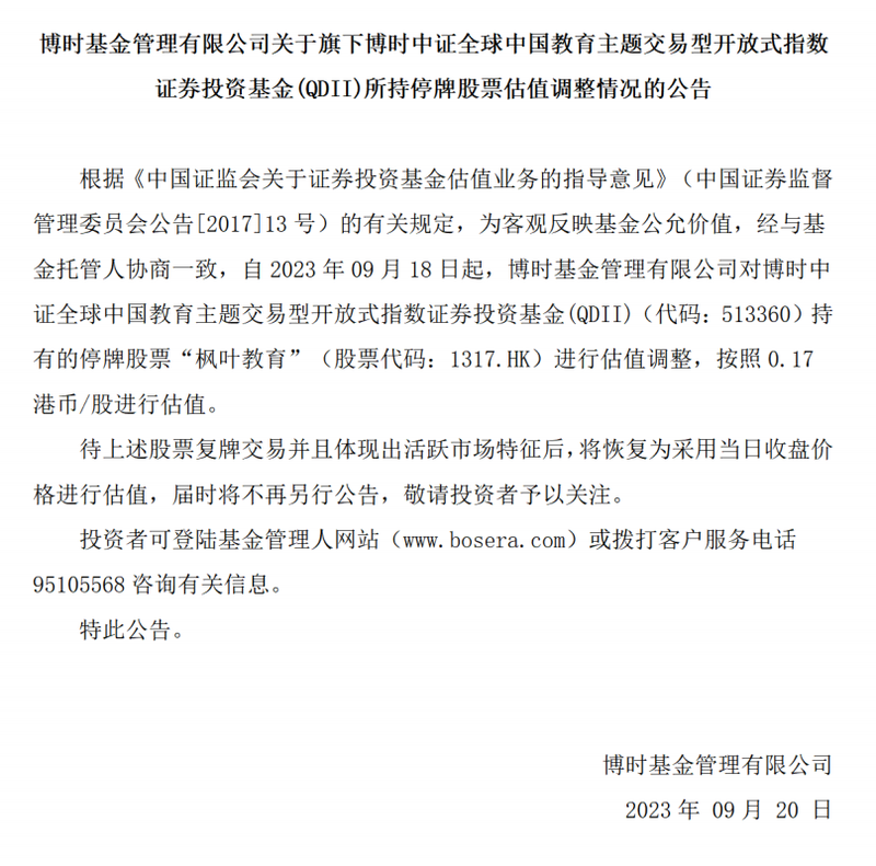 如此情形似乎也让资方意识到了风险。9月20日,博时中证全球中国教育ETF(下称“教育ETF”,SH:513360)公告称,为客观反映基金公允价值,经与基金托管人协商一致,自2023年9月18日起对持有的停牌股票“枫叶教育”进行估值调整,按照0.17港元/股进行估值。