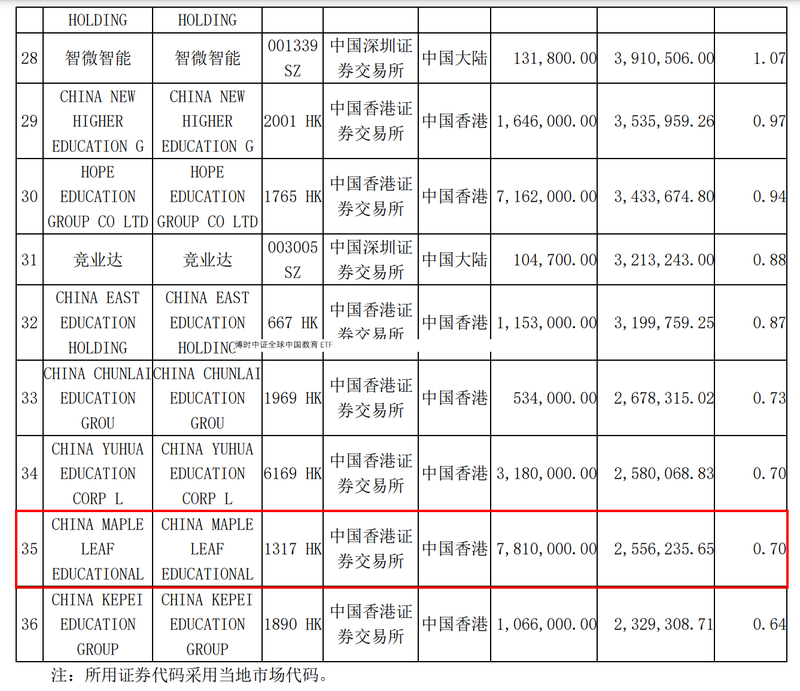 据教育ETF的2023年中报显示,其仍持有枫叶教育781万股,持仓市值255.62万元,占净值比例为0.7%,市值排名第35位。枫叶教育虽然早早被中证全球中国教育主题指数剔除,但是由于其一直处于停牌状态,教育ETF无法将其从投资组合中剔除出去。