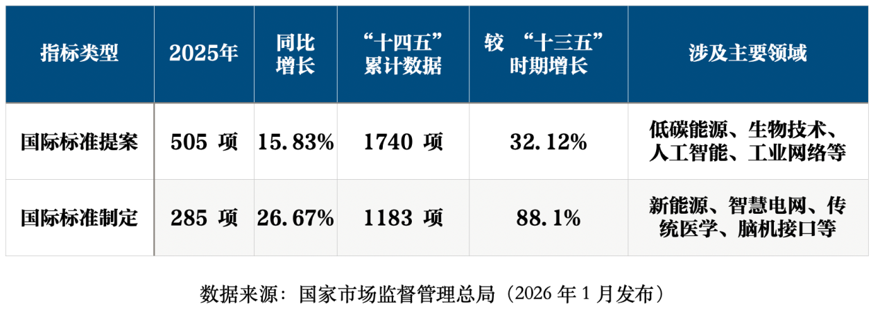 随着技术进步和产业升级,我国标准国际化工作已取得突破进展。国家市场监督管理总局今年1月发布的数据显示,2025年我国在低碳能源、生物技术、人工智能、工业网络等各领域,向ISO、IEC提出国际标准提案505项,同比增长15.83%。“十四五”期间,我国累计提案达1740项,较“十三五”增长32.12%。国际标准制定方面,2025年我国在新能源、智慧电网、传统医学、脑机接口等各领域,共牵头制定发布ISO、IEC国际标准285项,同比增长26.67%。“十四五”期间,我国累计牵头制定并发布ISO、IEC国际标准1183项,较“十三五”时期增长88.1%。