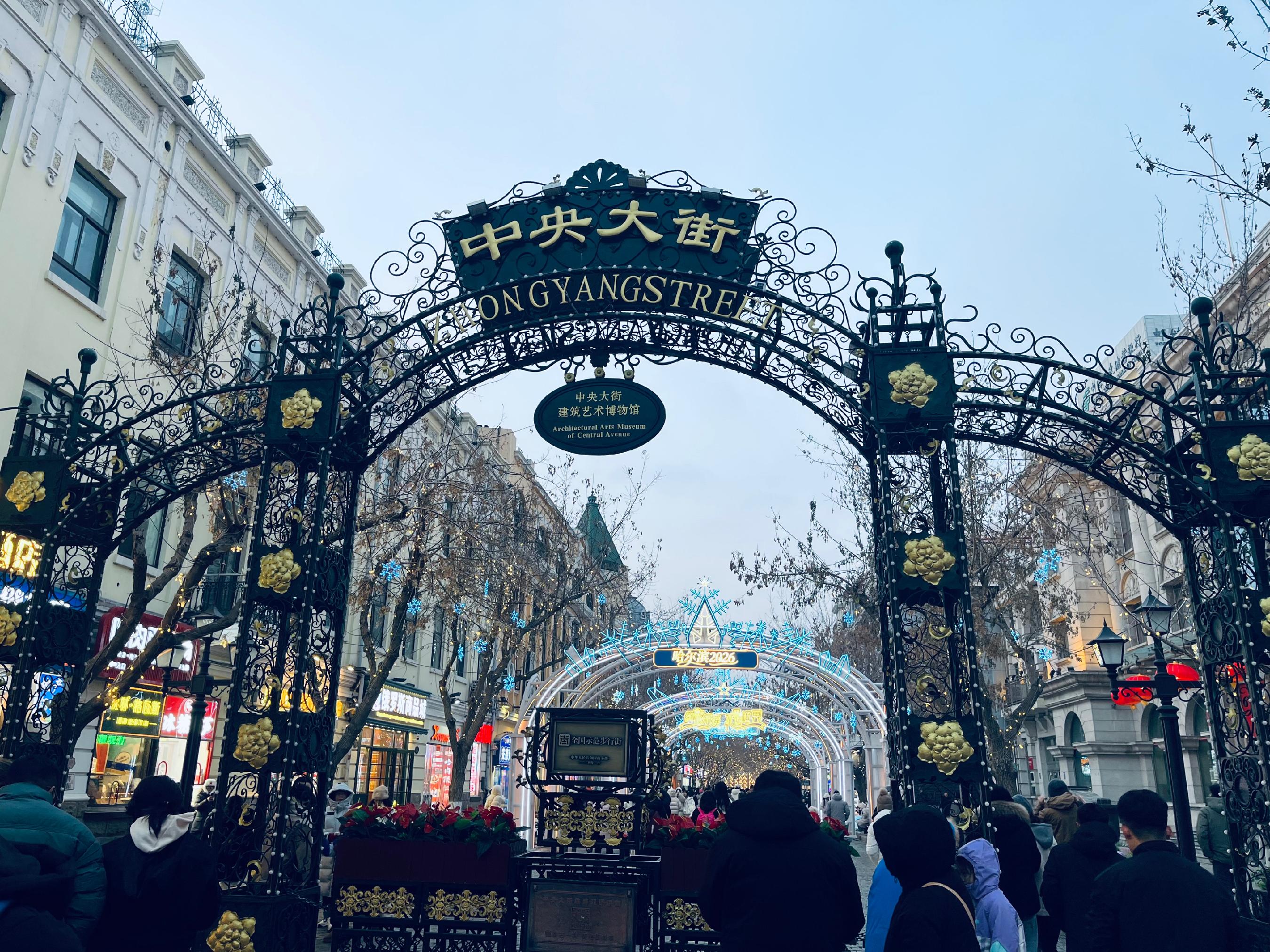 一千四百五十米长的哈尔滨中央大街上,游人摩肩接踵。