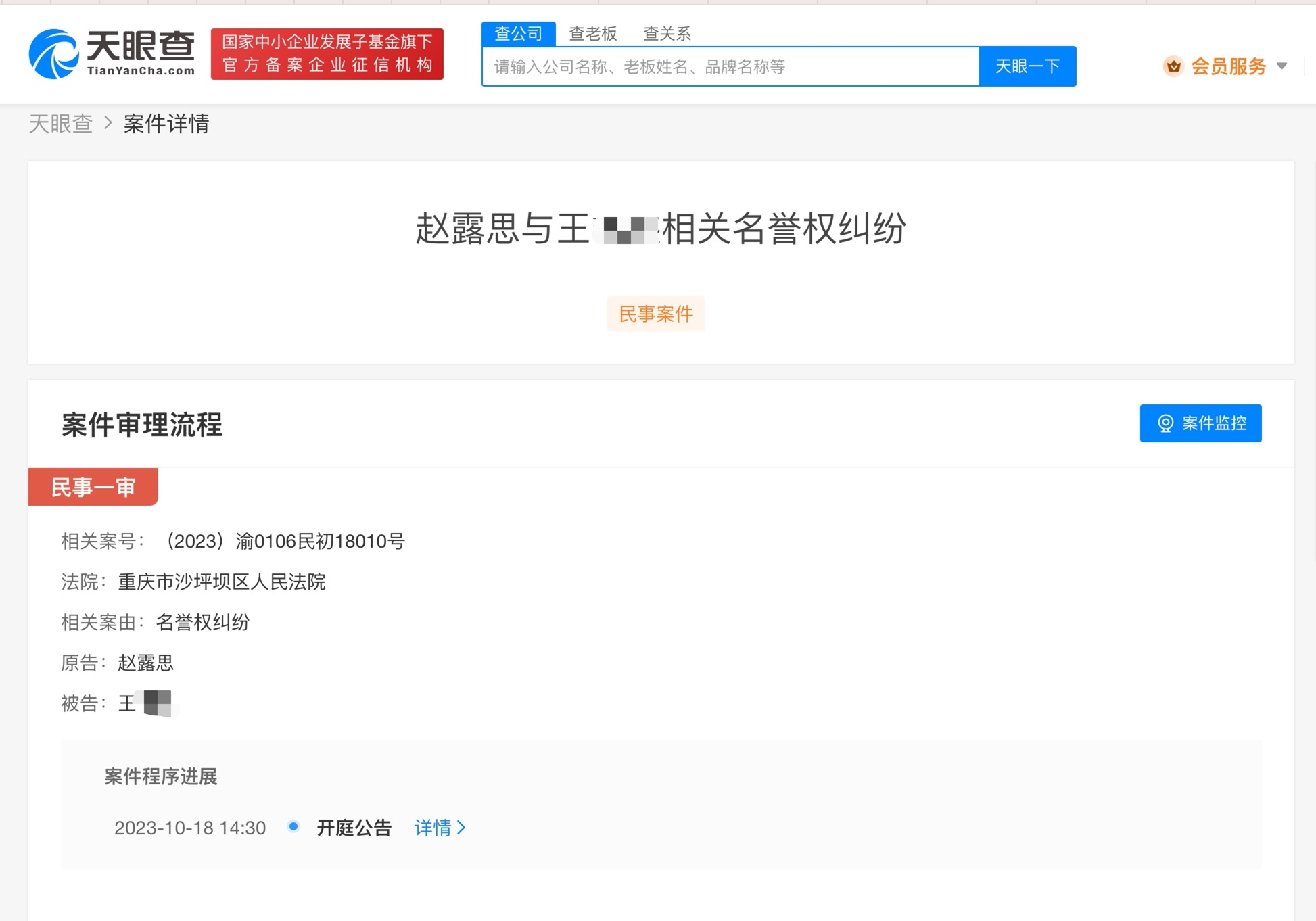 天眼查App显示,近日,赵露思与王某某相关名誉权纠纷案新增开庭公告,原告为赵露思,该案将于10月18日在重庆市沙坪坝区人民法院开庭审理。