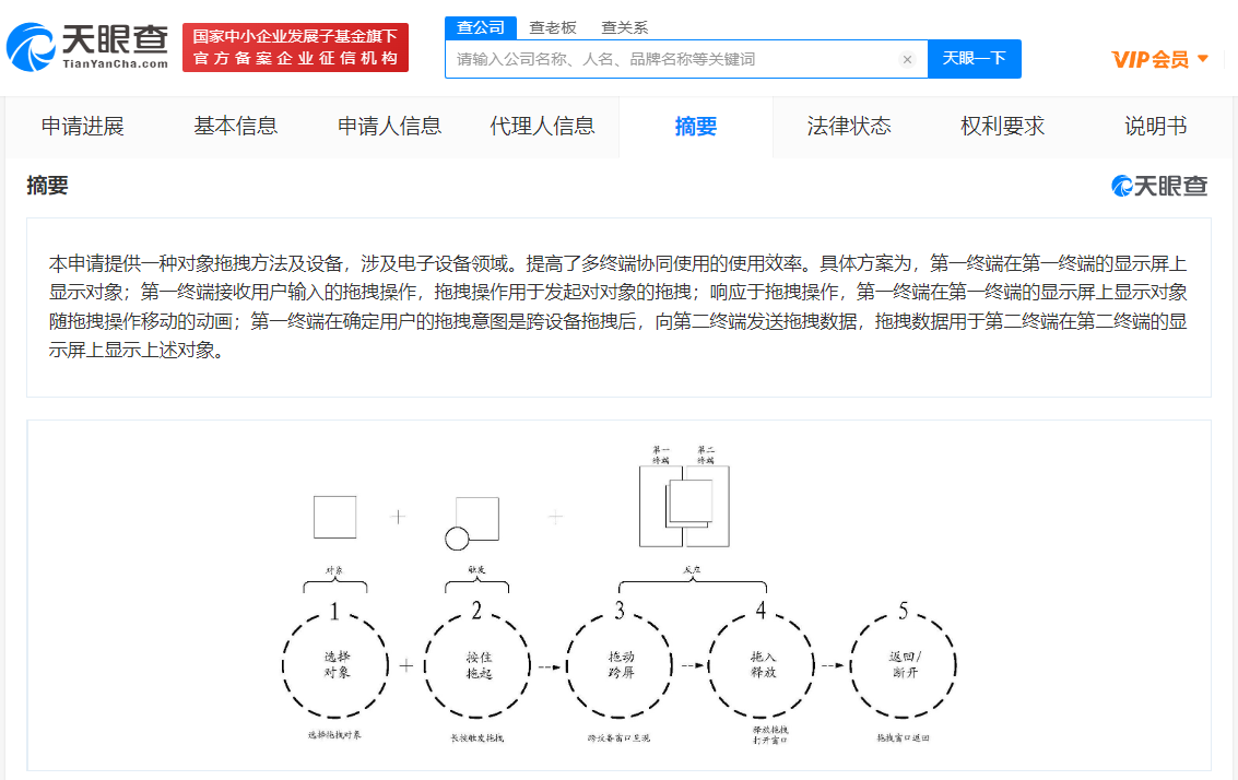 天眼查App显示,近日,华为技术有限公司申请的“一种对象拖拽方法及设备”专利公布。