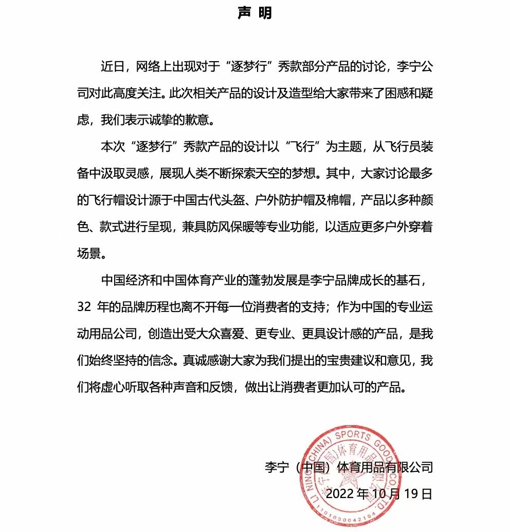 10月19日上午,李宁官微发布声明:近日,网络上出现对于“逐梦行”秀款部分产品的讨论,李宁公司对此高度关注。此次相关产品的设计及造型给大家带来了困惑和疑虑,我们表示诚挚的歉意。