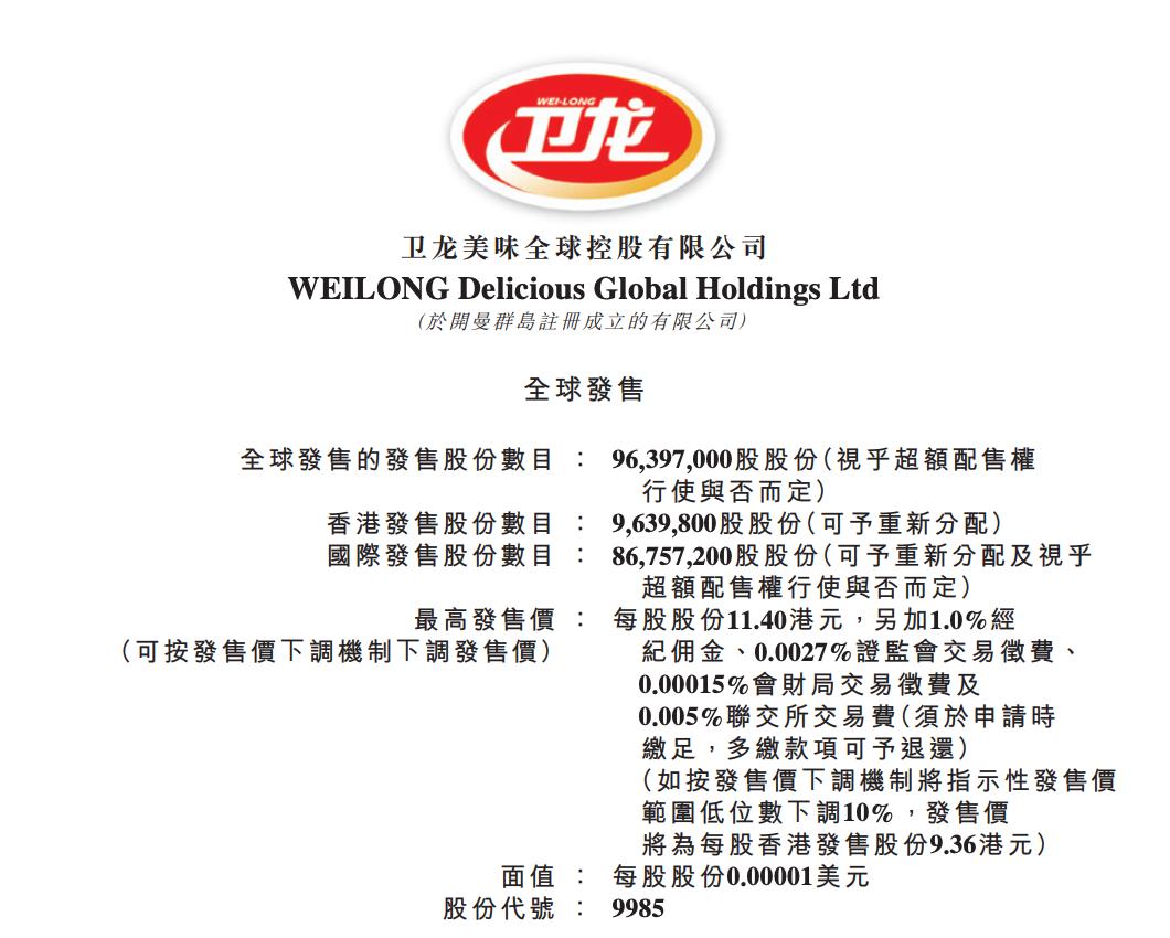 直到12月5日,卫龙在港交所发布公告,拟全球发售9639.7万股股份,其中在中国香港发售股份963.98万股,占比10%;国际发售股份8675.72万股,占比90%,另有15%超额配售权。卫龙发行价将不低于10.40港元/股,不高于11.40港元/股。12月5日至8日正式公开发售。