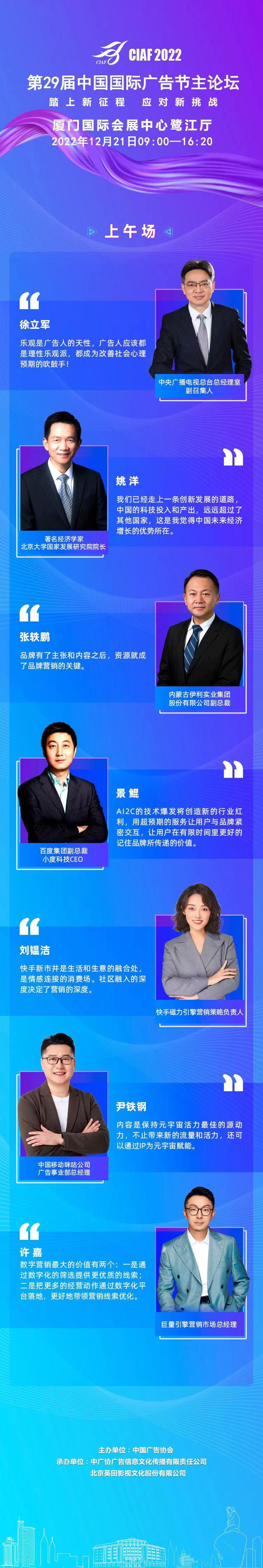 本届广告节主论坛以“踏上新征程,应对新挑战”为主题。上午场论坛,中央广播电视总台总经理室副召集人徐立军,著名经济学家、北京大学国家发展研究院院长姚洋,内蒙古伊利实业集团股份有限公司副总裁张轶鹏,百度集团副总裁、小度科技CEO景鲲,快手磁力引擎营销策略负责人刘韫洁,中国移动咪咕公司广告事业部总经理尹铁钢、巨量引擎营销市场总经理许嘉在内的诸多知名品牌、领军广告公司及行业媒体意见领袖轮番进行主题演讲,分享新时代背景下的机遇与挑战,传递品牌向上的能量与趋势方向。