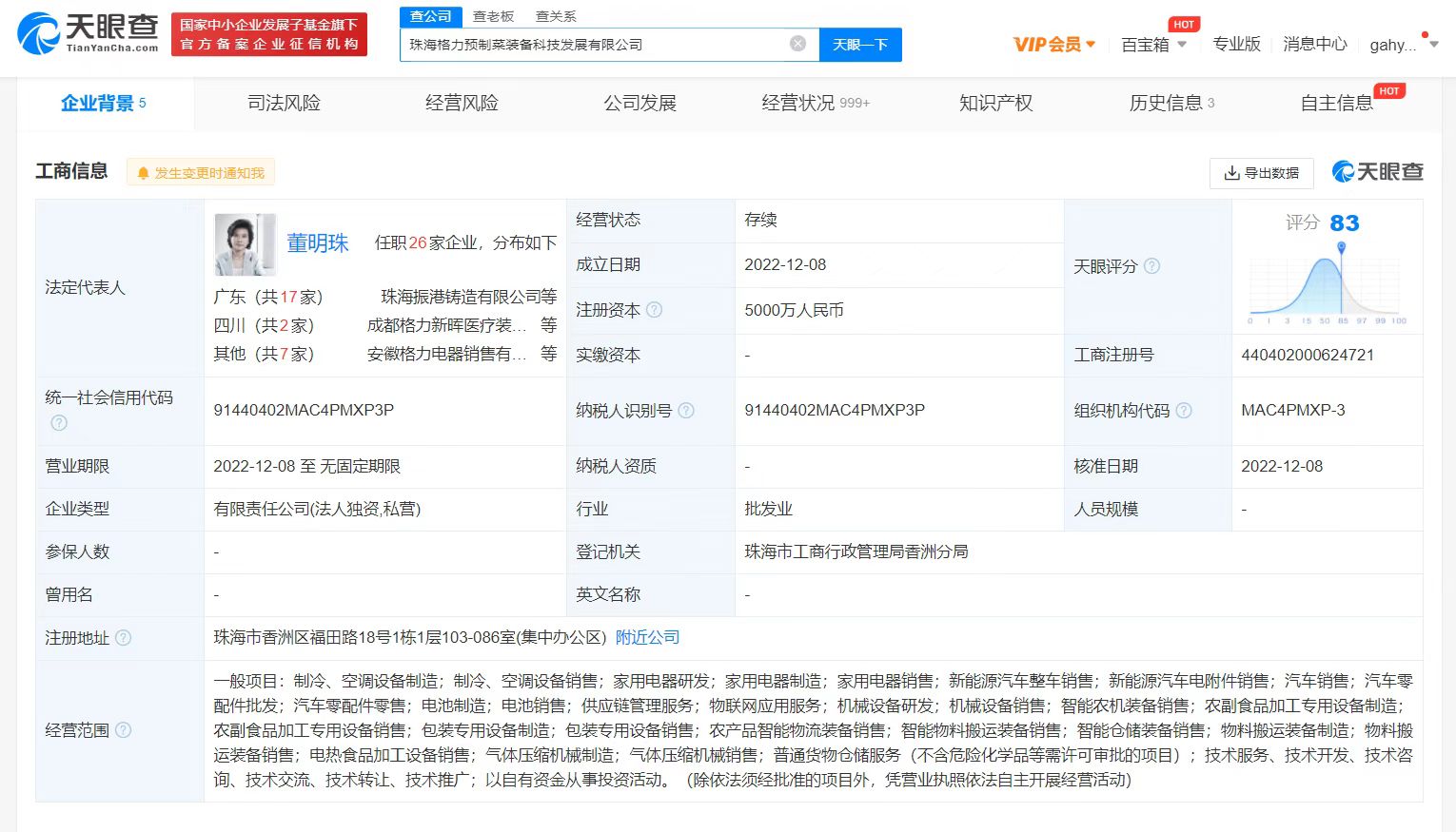天眼查App显示,近日,珠海格力预制菜装备科技发展有限公司成立,法定代表人为董明珠,注册资本5000万元人民币,经营范围包含:新能源汽车整车销售;供应链管理服务;农产品智能物流装备销售;电热食品加工设备销售等。天眼查股权穿透显示,该公司由格力电器100%控股。