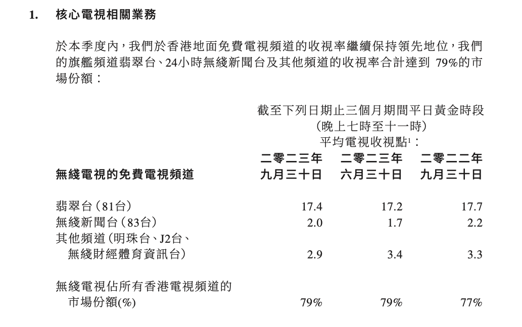 自制剧集一直以来作为TVB的核心收入来源,承担着营收的重要责任。公告称,TVB旗舰频道翡翠台、24小时无线新闻台以及其他频道的收视率,合计占79%的市场份额。