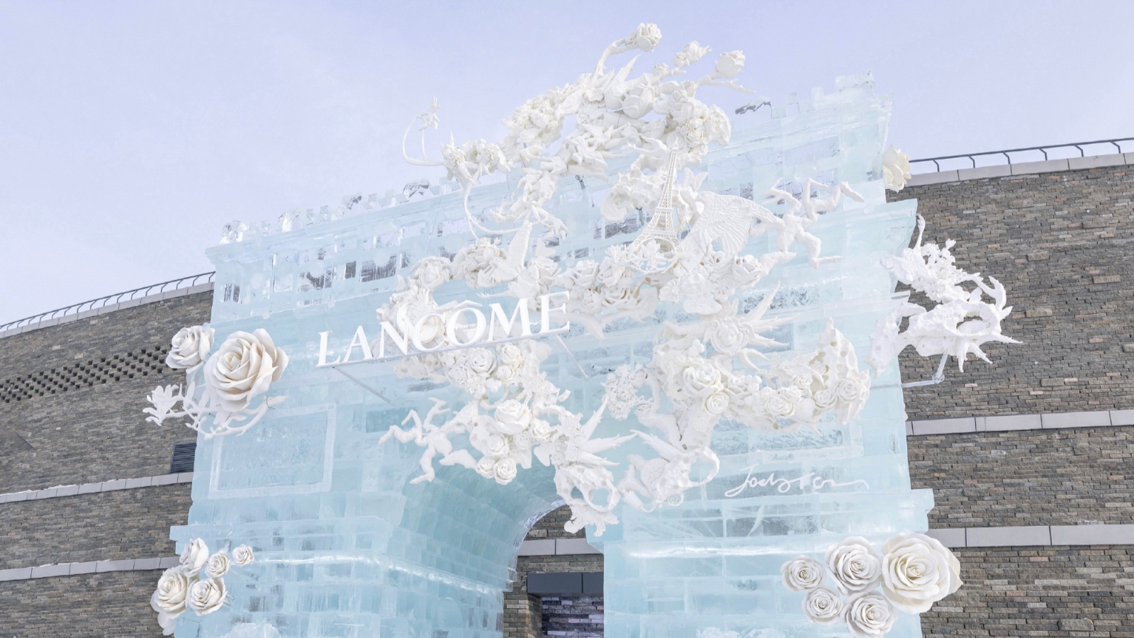 此次装置由兰蔻玫瑰、凯旋门与龙相遇的灵感出发,Jacky Tsai 用花卉、植物等自然元素赋予极具中国龙以独有的浪漫,让中式传统与西式浪漫完美交融。「花龙」冰雕记录了大自然的真实和美丽,也展现了其脆弱性,兰蔻也希望通过这个作品表达品牌的环保主张。