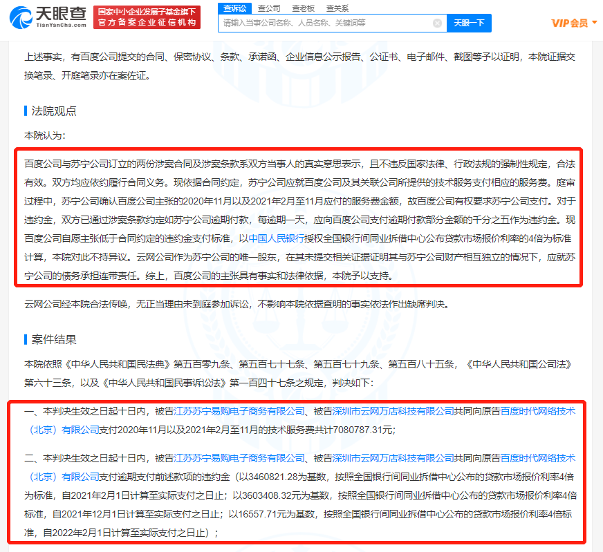 法院审理认为,百度公司与苏宁公司订立的涉案合同及条款系双方当事人的真实意思表示,应依约履行。云网公司作为苏宁公司的唯一股东,在未提交证据证明其与苏宁公司财产相互独立的情况下,应承担连带责任。最终,法院判决两被告共同向原告支付技术服务费708万余元及相应违约金。
