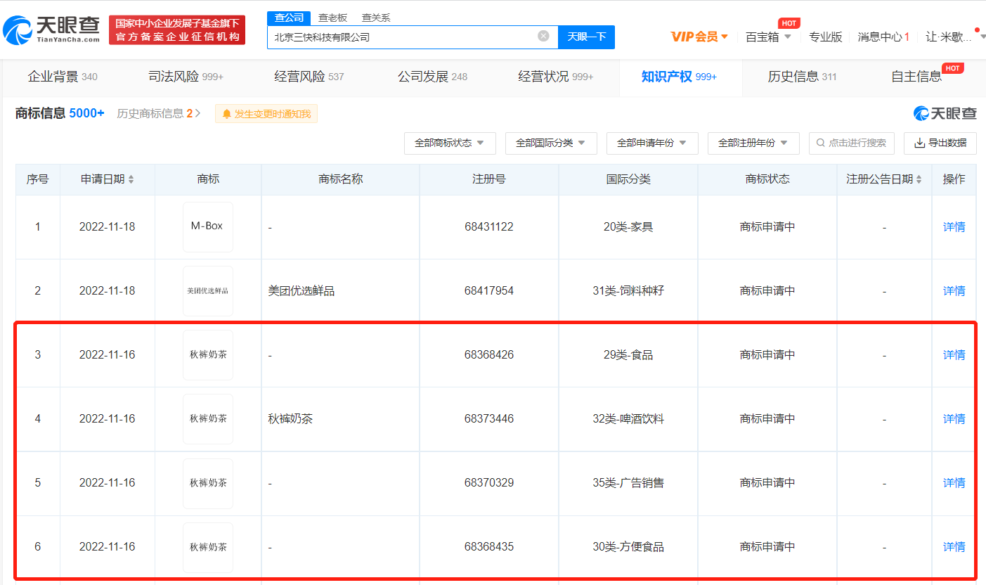 天眼查App显示,近日,北京三快科技有限公司申请注册4枚“秋裤奶茶”商标,国际分类包括方便食品、啤酒饮料、广告销售等,当前状态均为申请中。据悉,此前,美团外卖与新裤子乐队在上海地区推出了一款“秋裤杯套”的奶茶联名周边。