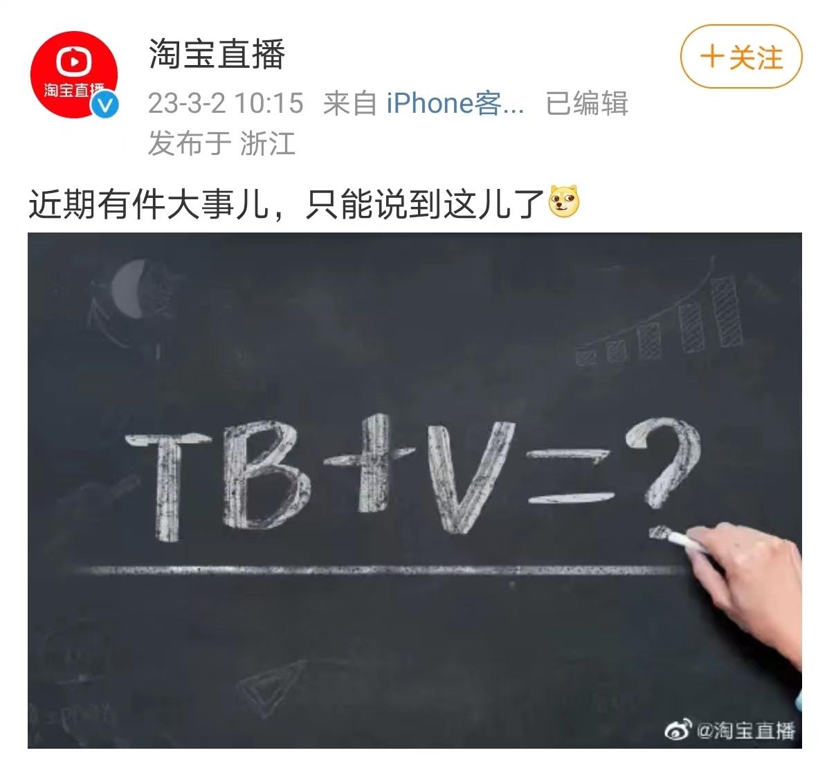 3月2日,淘宝直播官方微博发布消息“近期有件大事,只能说到这儿了”,并配图“TB+V=?”暗示之后的合作;3月3日正式宣布,“TVB识货”入驻淘宝直播间,开创“港剧式直播”。