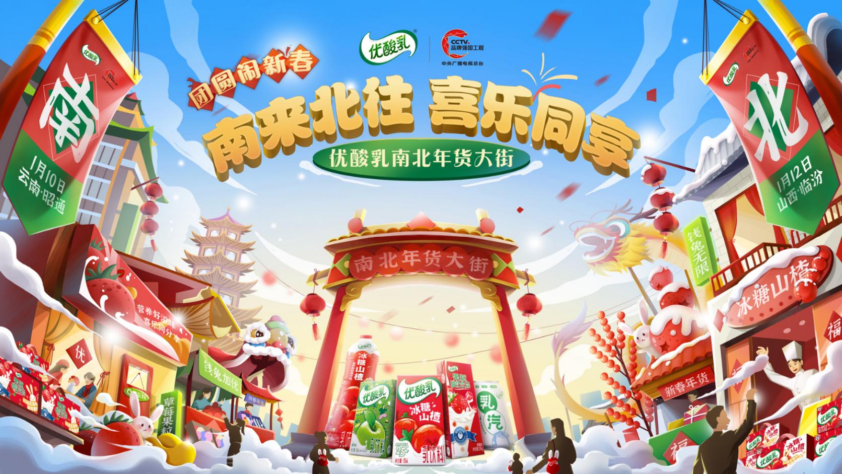 作为 25 年的国民品牌,优酸乳洞察到大家想要热闹过年的情绪,通过与当地政府合作,为乡镇的父老乡亲打造一次从南至云南、北至山西的「南来北往,喜乐同享」的年货大街,线上线下同时联动,先后展开活动先导片、线下年货大街、《寻找年味》纪实视频与海报的年味三部曲,带大家回到记忆中充满烟火气的乡镇市集。