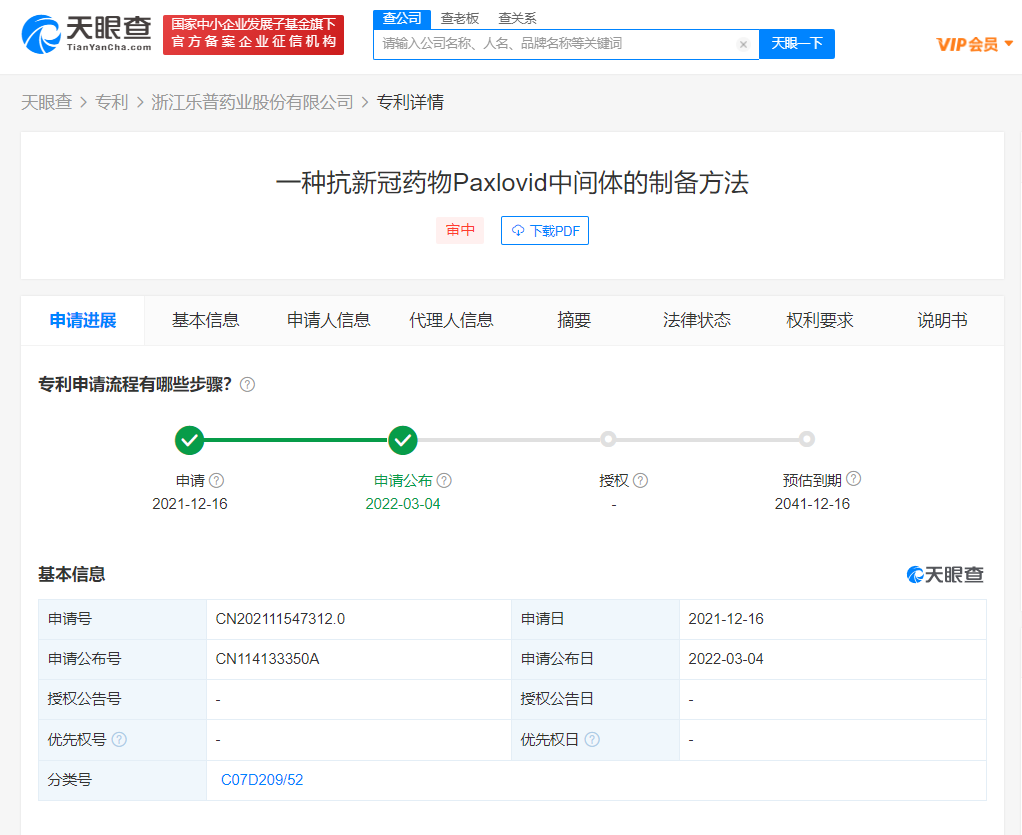 天眼查App显示,国内多家公司申请的“Paxlovid”相关专利已公布,申请人包括浙江乐普药业股份有限公司、爱斯特(成都)生物制药股份有限公司、杭州国瑞生物科技有限公司等。其中,最早的“Paxlovid”专利申请于2021年12月,为浙江乐普药业股份有限公司申请的“一种抗新冠药物Paxlovid中间体的制备方法”。