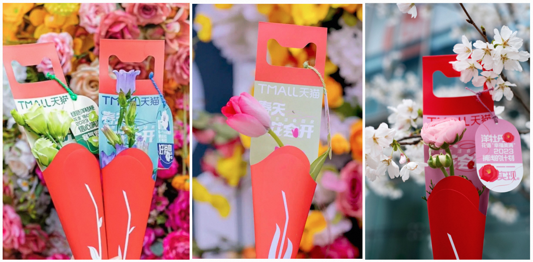 本次天猫特意挑选了5种不同颜色的鲜花,单独撰写了祝福文案:【红色的郁金香】就像举着小小的「红酒杯」,我们一起庆祝春天的回归;【黄色的非洲菊】握着一束小太阳,扑向春天,生活又闪烁着细细碎碎的光;【绿色的洋桔梗】绿色洋桔梗,花语「信心」,2023,信心满满,寒气退散;【紫色的风铃花】听,每一个小小的喇叭,都在告诉你关于春天的好消息;【粉色的洋牡丹】洋牡丹,花语「幸福美满」,2023,搁浅的计划,一一实现。