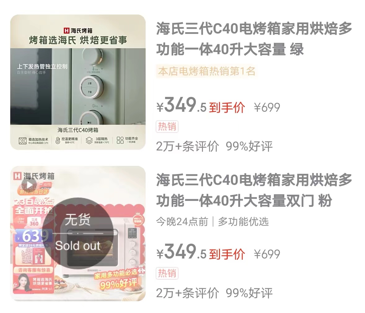 据网友爆料,这台备受争议的产品为“海氏三代C40升级款家用入门烤箱”,原先售价为799元/台,在李佳琦直播间售价为648元/台。在京东自营渠道,该产品最低降至319.5元/台,甚至299.5元/台。截止目前,该商品在京东自营已下架,价格调整为349.5元/台。