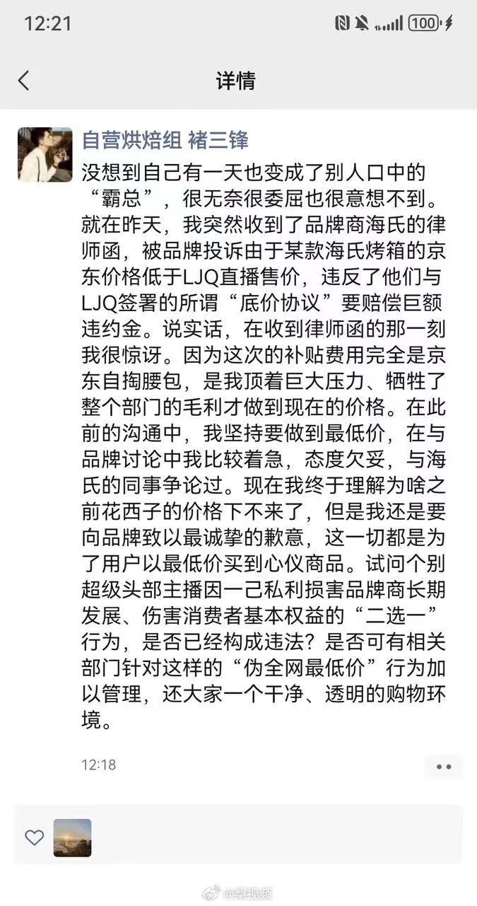 一位自称京东采销的工作人员声称收到品牌方海氏的律师函,表示:品牌方海氏指控京东平台违约修改定价,导致公司产品的销售利润为零甚至负数。因为京东单方面的低价操作,导致海氏与其他客户中被动违约,可能触发巨额赔偿风险。