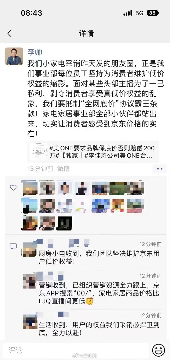 京东采销负责人也出面做出回应:“我们小家电采销昨天发的朋友圈,正是我们事业部每位员工坚持为消费者维护低价权益的缩影。面对某些头部主播为了一己私利,剥夺消费者享受真低价权益的乱象,我们要抵制“全网底价”协议霸王条款!家电家居事业部全部小伙伴都站出来,切实让消费者感受到京东价格的实在!”