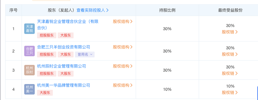 虽然小杨哥加入讨伐李佳琪的“嘴炮”的阵营,但据天眼查App显示,疯狂小杨哥旗下公司与美腕旗下公司已合资开公司,该公司名为杭州美羊羊科技有限公司,成立于2022年7月,法定代表人为王腾,注册资本500万人民币。该公司由天津嘉锐企业管理合伙企业(有限合伙)、合肥三只羊创业投资有限公司、杭州辰时企业管理有限公司、杭州美一华品牌管理有限公司共同持股,其中合肥三只羊创业投资有限公司为疯狂小杨哥旗下公司,杭州美一华品牌管理有限公司由美腕旗下海南美腕投资有限公司持股29.6%。