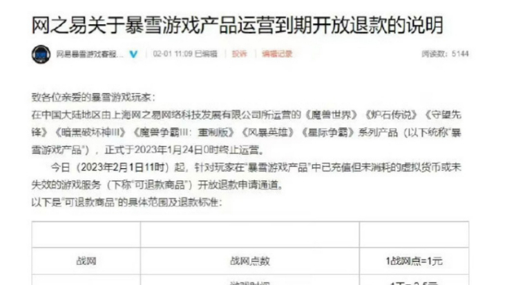 2月1日,网易暴雪游戏客服团队面向暴雪游戏国服玩家,发布了《网之易关于暴雪游戏产品运营到期开放退款的说明》。说明指出,在中国大陆地区由上海网之易网络科技发展有限公司所运营的《魔兽世界》《炉石传说》《守望先锋》《暗黑破坏神 III》《魔兽争霸 III:重制版》《风暴英雄》《星际争霸》系列产品,正式于2023年1月24日0时终止运营。网易暴雪游戏客服团队表示,今日(2023年2月1日)11时起,针对玩家在“暴雪游戏产品”中已充值但未消耗的虚拟货币或未失效的游戏服务开放退款申请通道。此外,提交退款申请的截止日期为2023年6月30日,未在截止日期前提交退款申请的玩家将被视为主动放弃相关权益。