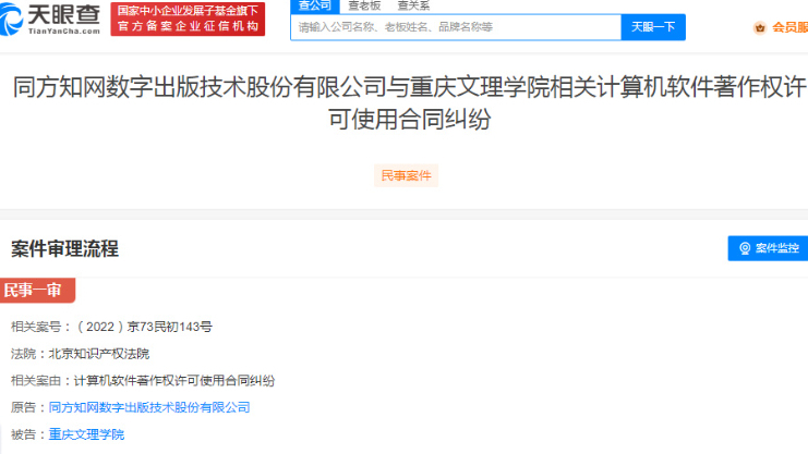 天眼查App显示,同方知网数字出版技术股份有限公司新增多则开庭公告,案由均为计算机软件著作权许可使用合同纠纷,案件将于3月23日在北京知识产权法院开庭审理。原告为同方知网公司,被告包括贺州学院、长春财经学院、陇东学院、湖南理工学院、重庆文理学院。