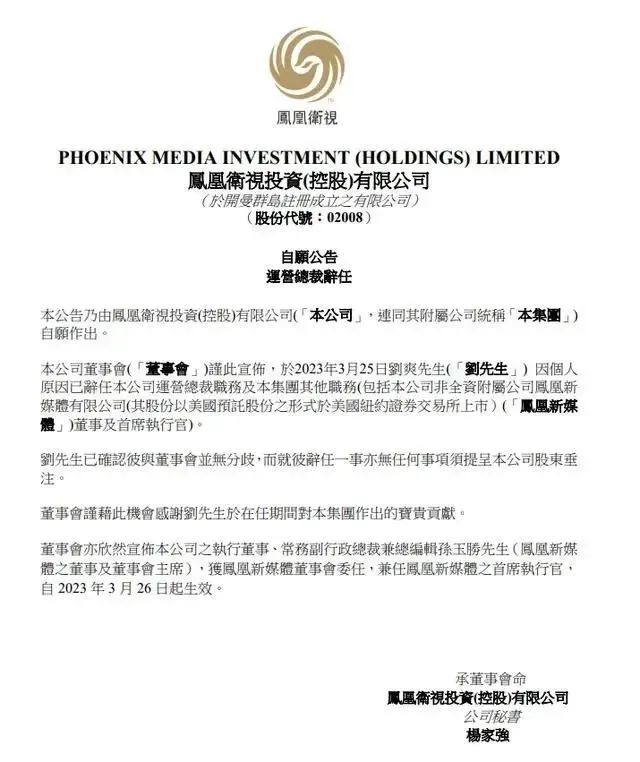 刚刚,凤凰卫视发布公告,2023年3月25日刘爽因个人原因已辞任公司运营总裁职务及集团其他职务(包括公司非全资附属公司凤凰新媒体有限公司董事及首席执行官)。