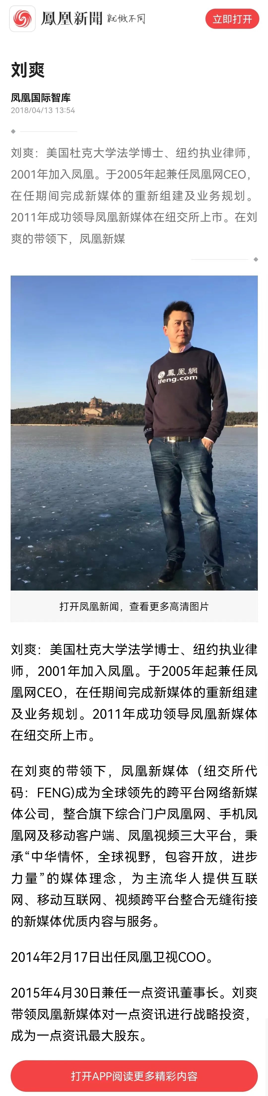 据查询,目前凤凰新闻客户端还保留着刘爽的个人资料。