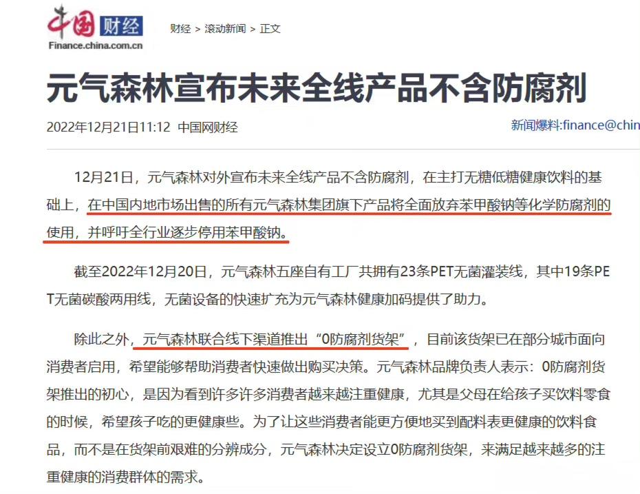 12月21日,元气森林宣布未来全线产品不含防腐剂,并在多地沃尔玛等连锁商超推出元气森林无防腐剂饮料货架。宣布在中国内地市场出售的所有元气森林集团旗下产品将全面放弃苯甲酸钠、山梨酸钾等化学防腐剂的使用。